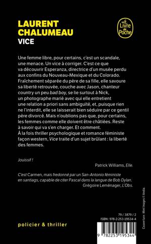 Une femme libre, pour certains, c’est un scandale, une menace. Un vice à corriger. C’est ce que va découvrir Esperanza, directrice d’un musée perdu aux confins du Nouveau-Mexique et du Colorado. Fraîchement séparée du père de sa fille, elle savoure sa liberté retrouvée, couche avec Jason, chanteur country un peu bad boy, se lie surtout à Nick, un photographe marié avec qui elle entretient une relation a priori sans ambiguïté, et, puisque rien ne l’interdit, elle se laisserait bien séduire par ce gentil père divorcé. Mais n’oublions pas que, pour certains, les femmes comme elle doivent être châtiées. Reste à savoir qui va s’en charger. Et comment. À la fois thriller psychologique et romance féministe façon western, Vice traite d’un sujet brûlant : la liberté des femmes.