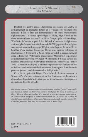 Le régime de Vichy et le Vatican ont entretenu des relations d'état à état. Comment le Vatican, sous l'autorité de Pie XII, jugeait-il ce régime soucieux de restaurer la place de l'Eglise catholique ? Comment voyait-il la politique de collaboration avec l'Allemagne et les mesures antisémites qui en découlaient ? Comment a-t-il géré la montée en puissance de la France Libre et tiré les conséquences de la chute de ce régime dont il avait reconnu la légitimité ?