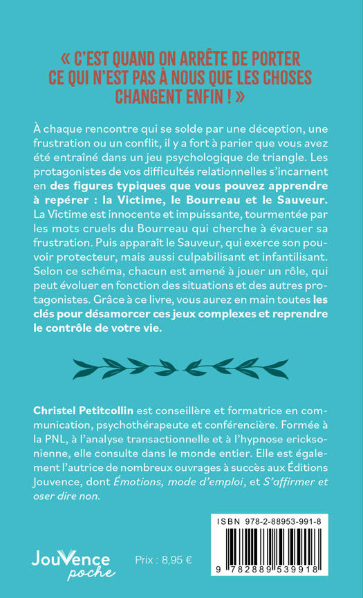La Victime est innocente et impuissante, tourmentée par les mots cruels du Bourreau qui cherche à évacuer sa frustration. Puis apparaît le Sauveur, qui exerce son pouvoir protecteur, mais aussi culpabilisant et infantilisant. Selon ce schéma, chacun est amené à jouer un rôle, qui peut évoluer en fonction des situations et des autres protagonistes. Grâce à ce livre, vous aurez en main toutes les clés pour désamorcer ces jeux complexes et reprendre le contrôle de votre vie.