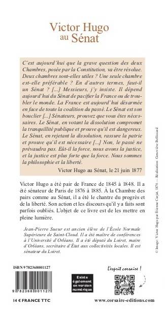 C'est aujourd'hui que la grave question des deux Chambres, posee par la Constitution, va etre resolue. Deux chambres sont-elles utiles? Une seule chambre est-elle preferable? En d'autres termes, faut-il un Senat? [...] Messieurs, j'y insiste. Il depend aujourd'hui du Senat de pacifier la France ou de troubler le monde. La France est aujourd'hui desarmee en face de toute la coalition du passe. Le Senat est son bouclier [...] Senateurs, prouvez que vous etes necessaires. Le Senat, en votant la dissolution compromet la tranquillite publique et prouve qu'il est dangereux. Le Senat, en rejetant la dissolution, rassure la patrie et prouve qu'il est necessaire [...] Non, le passe ne prevaudra pas. Eut-il la force, nous avons la justice, et la justice est plus forte que la force. Nous sommes la philosophie et la liberte. - Victor Hugo au Senat, le 21 juin 1877 Victor Hugo a ete pair de France de 1845 a 1848. Il a ete senateur de Paris de 1876 a 1885. A la Chambre des pairs comme au Senat, il a ete le chantre du progres et de la liberte. Son action et les discours qu'il y a faits sont parfois oublies. L'objet de ce livre est de les mettre en pleine lumiere.