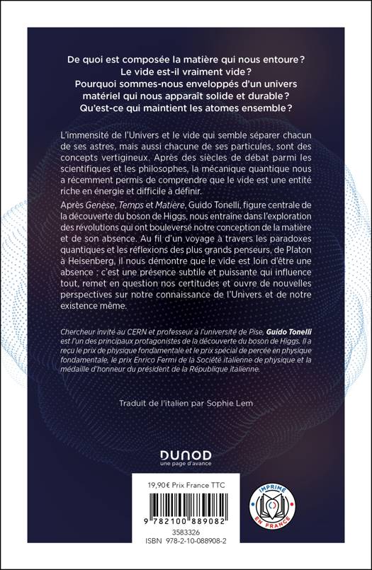 L’immensité de l’univers et le vide qui semble séparer chacun de ses astres, mais aussi chacune de ses particules, sont des concepts vertigineux qui peuvent même être anxiogènes pour certains d’entre nous. Scientifiques et philosophes ont débattu autour de ce vide au fil des siècles : Démocrite théorise les atomes, Newton l’imagine comme un espace immobile et absolu, Einstein le nie et développe la théorie de la relativité. Récemment, la mécanique quantique nous a permis de comprendre que le vide est une entité riche en énergie et difficile à définir. Avec un style narratif certain, Guido Tonelli, figure centrale de la découverte du boson de Higgs, tisse un lien entre l’histoire des sciences, la philosophie et la cosmologie moderne, nous entraînant dans l’exploration des révolutions qui ont bouleversé notre conception de la matière et de son absence. Il nous emmène dans les laboratoires où la physique des particules tente de percer les secrets de la matière, voyage avec nous à travers les paradoxes quantiques et les réflexions des plus grands penseurs, de Platon à Heisenberg, afin de démontrer que le vide est loin d’être une absence : c’est une présence subtile et puissante qui influence tout. Un livre fascinant qui remet en question nos certitudes et ouvre de nouvelles questions sur l’univers comme sur notre existence.