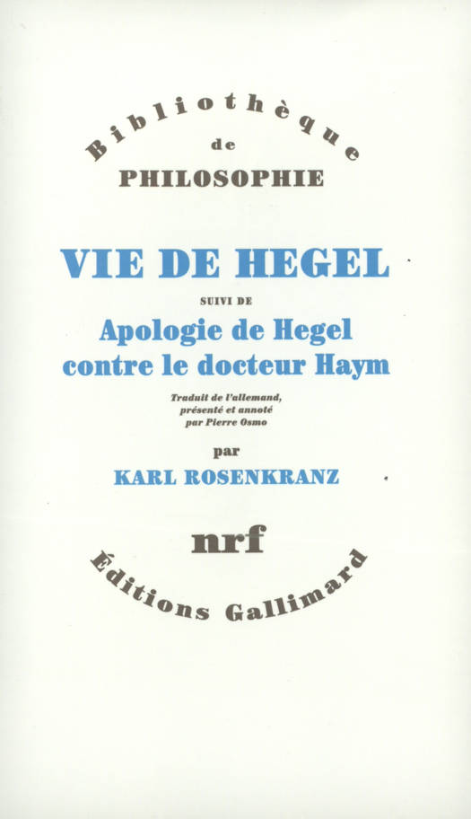 Voici enfin mise à la disposition du public français la Vie de Hegel par Karl Rosenkranz. Publiée en 1844, treize ans après la mort de Hegel, citée dans d'innombrables commentaires de l'oeuvre hégélienne, cette première biographie du philosophe par un de ses disciples est un classique de la biographie philosophique, soucieuse de restituer le sens des oeuvres autant que celui d'une vie, en les reliant en outre au contexte historique. Au-delà des éclairages qu'elle apporte, à la faveur d'une irremplaçable proximité chronologique et spirituelle, sur la genèse de la pensée hégélienne, elle fournit un précieux tableau de la vie universitaire dans l'Allemagne du premier tiers du XIXᵉ siècle, mais surtout du bouillonnement intellectuel qui a marqué cette époque. L'Apologie de Hegel contre le docteur Haym, qui lui fait suite, permet de faire le point, quatorze ans après, sur la réception contrastée de l'hégélianisme en Allemagne, au moment où la montée du nationalisme modifie la perception des aspects les plus marquants de la philosophie de Hegel. Réponse à Rudolf Haym, l'auteur de Hegel et son temps, la deuxième grande biographie consacrée à Hegel (parue en 1857), ce texte de combat prend place dans les vicissitudes du post-hégélianisme qui parvient au terme de sa décomposition. À quelque distance l'une de l'autre, la Vie et l'Apologie forment un tout, instructif par ce qu'il montre de la puissance d'une pensée aux prises avec le temps qui s'en nourrit et qui l'attaque.