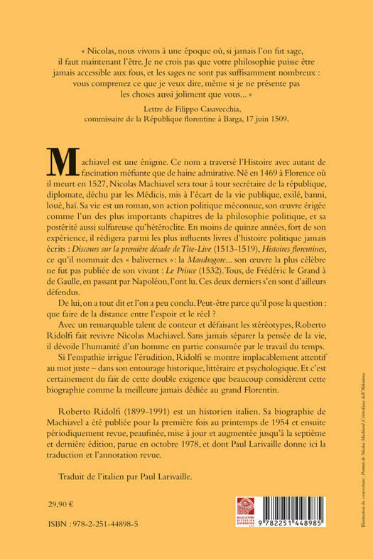 Avec un remarquable talent de conteur et défaisant les stéréotypes, Roberto Ridolfi fait revivre Nicolas Machiavel. Sans jamais séparer la pensée de la vie, il dévoile l’humanité d’un homme en partie consumée par le travail du temps.