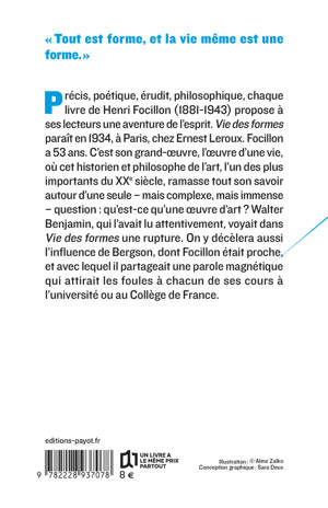 Précis, poétique, érudit, philosophique, chaque livre de Henri Focillon (1881-1943) propose à ses lecteurs une aventure de l'esprit. Vie des formes paraît en 1934, à Paris, chez Ernest Leroux. Focillon a 53 ans. C'est son grand-oeuvre, l'oeuvre d'une vie, où cet historien et philosophe de l'art, l'un des plus importants du XXe siècle, ramasse tout son savoir autour d'une seule - mais complexe, mais immense - question : qu'est-ce qu'une oeuvre d'art ? Walter Benjamin, qui l'avait lu attentivement, voyait dans Vie des formes une rupture. On y décèlera aussi l'influence de Bergson, dont Focillon était proche, et avec lequel il partageait une parole magnétique qui attirait les foules à chacun de ses cours à l'université ou au Collège de France.
