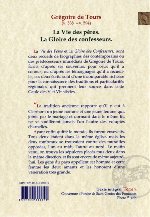 La Vie des Pères et la Gloire des Confesseurs, sont deux recueils de biographies des contemporains ou des prédécesseurs immédiats de Grégoire de Tours. Écrits d'après ses souvenirs, pour ceux qu'il a connus, ou d'après les témoignages qu'il a recueillis, ces deux écrits sont d'une incomparable richesse pour la connaissance des traditions et particularités régionales qui prennent leur source dans cette Gaule des V et VIe siècles.