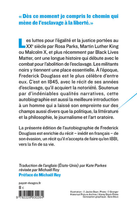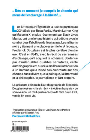 Les luttes pour l'égalité et la justice sociale portées au XXe siècle par Rosa Parks, Martin Luther King ou Malcolm X se poursuivent aujourd'hui grâce au mouvement Black Lives Matter. Elles ont une longue histoire, qui commence avec le combat pour l'abolition de l'esclavage. Les Noirs y tiennent dès le début une place essentielle. Frederick Douglass est le plus célèbre d'entre eux. C'est en 1845, avec le récit de ses années d'esclavage, qu'il acquiert la na notoriété . Soutenue par d'indéniable qualités narratives, cette autobiographie est aussi la meilleure introduction à un homme qui a laissé son empreinte sur des champs aussi divers que la politique, la littérature et la philosophie, le journalisme et l'art oratoire.