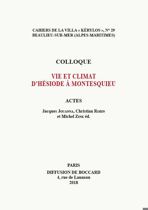 Ensemble de contributions analysant le rapport de la pensée, de la littérature et des arts aux questions climatiques et environnementales, des philosophes grecs de l'époque classique jusqu'à Montesquieu. Elles interrogent la perception du climat par les auteurs anciens et ses représentations : le climat et l'environnement botanique chez Théophraste, la crue du Nil dans la mosaïque de Préneste...