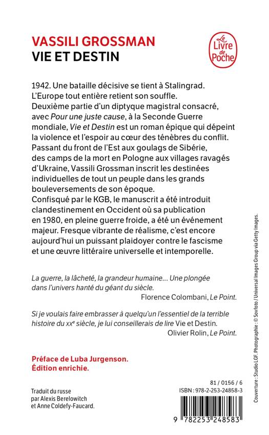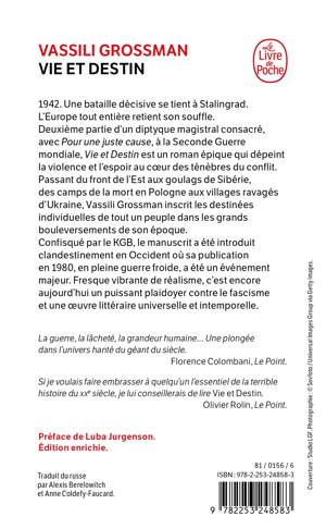 1942. Une bataille décisive se tient à Stalingrad. L’Europe tout entière retient son souffle. Deuxième partie d’un diptyque magistral consacré, avec Pour une juste cause, à la Seconde Guerre mondiale, Vie et Destin est un roman épique qui dépeint la violence et l’espoir au cœur des ténèbres du conflit. Passant du front de l’Est aux goulags de Sibérie, des camps de la mort en Pologne aux villages ravagés d’Ukraine, Vassili Grossman inscrit les destinées individuelles de tout un peuple dans les grands bouleversements de son époque. Confisqué par le KGB, le manuscrit a été introduit clandestinement en Occident où sa publication en 1980, en pleine guerre froide, a été un événement majeur. Fresque vibrante de réalisme, c’est encore aujourd’hui un puissant plaidoyer contre le fascisme et une œuvre littéraire universelle et intemporelle.