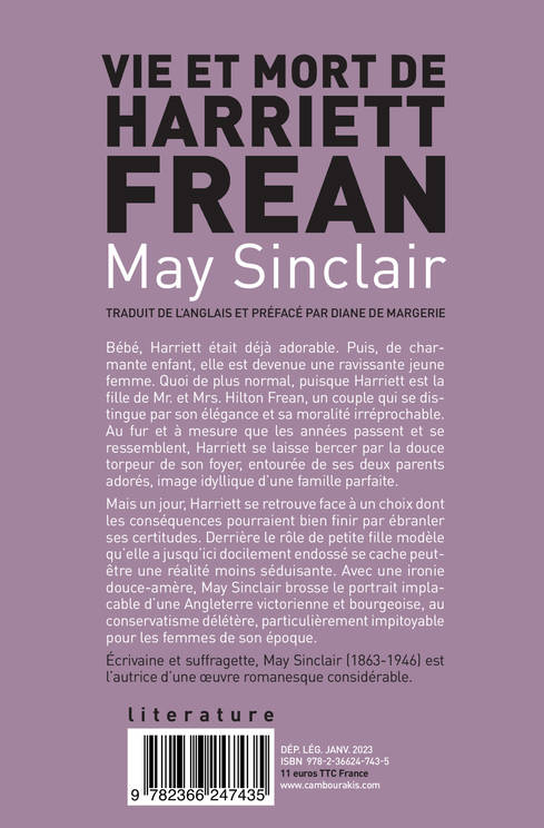 Bébé, Harriett était déjà adorable. Puis, de charmante enfant, elle est devenue une ravissante jeune femme. Quoi de plus normal, puisque Harriett est la fille de Mr. et Mrs. Hilton Frean, un couple qui se distingue par son élégance et sa moralité irréprochable. Au fur et à mesure que les années passent et se ressemblent, Harriett se laisse bercer par la douce torpeur de son foyer, entourée de ses deux parents adorés, image idyllique d'une famille parfaite. Mais un jour, Harriett se retrouve face à un choix dont les conséquences pourraient bien finir par ébranler ses certitudes. Derrière le rôle de petite fille modèle qu'elle a jusqu'ici docilement endossé se cache peut-être une réalité moins séduisante. Avec une ironie douce-amère, May Sinclair brosse le portrait implacable d'une Angleterre victorienne et bourgeoise, au conservatisme délétère, particulièrement impitoyable pour les femmes de son époque. Écrivaine et suffragette, May Sinclair (1863-1946) est l'autrice d'une oeuvre romanesque considérable.