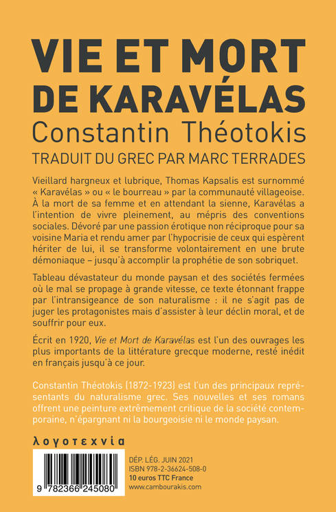 Vieillard hargneux et lubrique, Thomas Kapsalis est surnommé « Karavélas » ou « le bourreau » par la communauté villageoise. À la mort de sa femme et en attendant la sienne, Karavélas a l'intention de vivre pleinement, au mépris des conventions sociales. Dévoré par une passion érotique non réciproque pour sa voisine Maria et rendu amer par l'hypocrisie de ceux qui espèrent hériter de lui, il se transforme volontairement en une brute démoniaque - jusqu'à accomplir la prophétie de son sobriquet. Tableau dévastateur du monde paysan et des sociétés fermées où le mal se propage à grande vitesse, ce texte étonnant frappe par l'intransigeance de son naturalisme : il ne s'agit pas de juger les protagonistes mais d'assister à leur déclin moral, et de souffrir pour eux. Écrit en 1920, Vie et Mort de Karavélas est l'un des ouvrages les plus importants de la littérature grecque moderne, resté inédit en français jusqu'à ce jour.