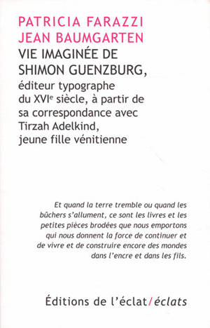 Le Livre de Coutumes de Shimon Guenzburg, paru à Venise en 1593 et traduit par Jean Baumgarten (Des coutumes qui font vivre, L'éclat, 2021) a révélé un personnage haut en couleur qui contribua, grâce au livre, à ce que le judaïsme survive à l'exil et aux persécutions. Qu'est-ce qui fait qu'au moment du plus grand danger des individus se consacrent à coucher sur le papier les us et les coutumes d'une communauté qui risque de disparaître ? On ne sait presque rien de ce Shimon Guenzburg, mais son action est d'importance. Comment la raconter ? L'imaginaire vient alors supplanter l'Histoire, comme ' la coutume efface la Loi '. Sous la forme d'une correspondance entre l'éditeur typographe et la jeune vénitienne, Tirzah Adelkind, bien curieuse de son monde et de son temps, Patricia Farazzi et Jean Baumgarten font revivre ce qu'a pu être cette amitié par les livres dans le ghetto de Venise au XVIe siècle.