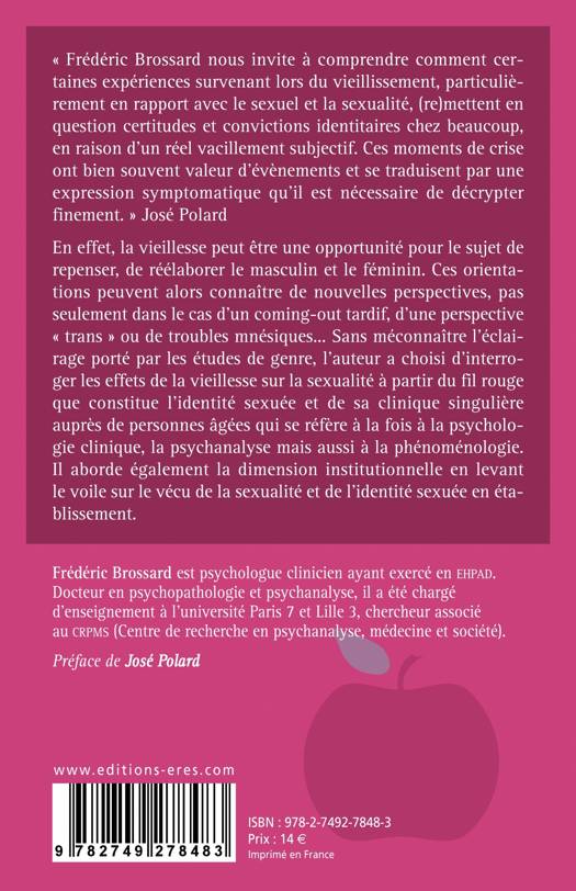 L’ambition de cet ouvrage est de mettre en lumière un champ que l’on a tendance à rendre invisible, celui des sexualités et des identités sexuées lors de la vieillesse. Cette époque de la vie peut être une opportunité pour le sujet âgé de repenser, de réélaborer le masculin et le féminin. Ces orientations peuvent en effet connaître de nouvelles perspectives, pas seulement dans le cas d’un coming-out tardif, d’une perspective « trans », ou de troubles mnésiques... Sans méconnaître l’éclairage porté par les études de genre, l’auteur a choisi de questionner les effets de la vieillesse sur la sexualité à partir de l’identité sexuée comme fil rouge de cet ouvrage et en s’appuyant sur sa clinique singulière, référée à la psychologie clinique, la psychanalyse mais aussi à la phénoménologie. L’angle institutionnel est également abordé permettant d’ouvrir le voile sur le vécu de la sexualité mais aussi de l’identité sexuée en établissement.