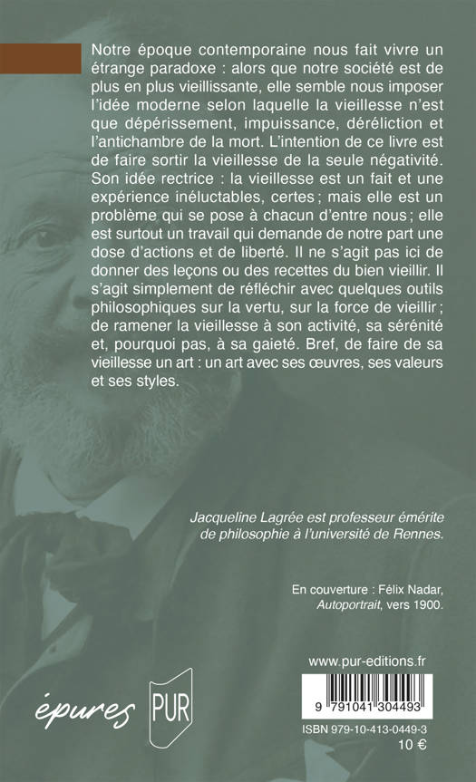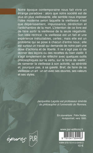 Notre époque contemporaine nous fait vivre un étrange paradoxe : alors que notre société est de plus en plus vieillissante, elle semble nous imposer l’idée moderne selon laquelle la vieillesse n’est que dépérissement, impuissance, déréliction et l’antichambre de la mort. L’intention de ce livre est de faire sortir la vieillesse de la seule négativité. Son idée rectrice : la vieillesse est un fait et une expérience inéluctables, certes ; mais elle est un problème qui se pose à chacun d’entre nous ; elle est surtout un travail qui demande de notre part une dose d’actions et de liberté. Il ne s’agit pas ici de donner des leçons ou des recettes du bien vieillir. Il s’agit simplement de réfléchir avec quelques outils philosophiques sur la vertu, sur la force de vieillir ; de ramener la vieillesse à son activité, sa sérénité et, pourquoi pas, à sa gaieté. Bref, de faire de sa vieillesse un art : un art avec ses oeuvres, ses valeurs et ses styles.