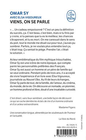 Acteur emblématique du film mythique Intouchables, Omar Sy est une icône de notre époque, qui compte parmi les personnalités préférées des Français. Omar Sy est aussi un homme et un père de famille qui se veut ordinaire. Pendant près de trois ans, il a accepté de vivre l’expérience d’un livre avec Elsa Vigoureux, journaliste au Nouvel Obs. Au fil de leurs échanges, Omar Sy parle de tout, de la famille, de l’amour, du cinéma, du monde, de la vie. On découvre un nomade, un pionnier, un homme profond et libre, doué d’une insatiable curiosité.