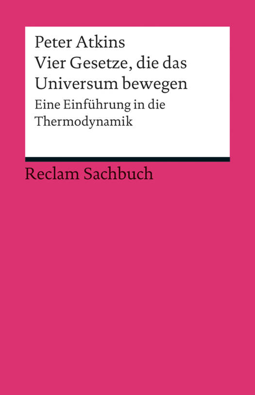 Die Thermodynamik prägt unser gesamtes Verständnis der Welt: Grundsätzlich definiert sie, was Temperatur ist (»Nullter« Hauptsatz). Ihr erster Hauptsatz behandelt die Energieerhaltung, ihr zweiter die Entropiezunahme (die Tendenz zur Auflösung im gesamten Universum) und der dritte Hauptsatz die Unerreichbarkeit des absoluten Nullpunktes der Temperatur. Diese vier Grundgesetze erklärt der für seine ebenso einfachen wie anschaulichen Veröffentlichungen preisgekrönte Chemiker und Wissenschaftler Peter Atkins auf faszinierende Art und Weise.