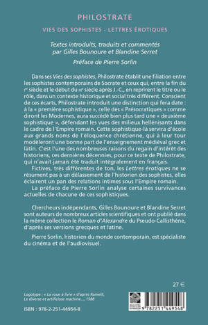 Dans ses Vies des sophistes, Philostrate etablit une filiation entre les sophistes contemporains de Socrate et ceux qui, entre la fin du ier siecle et le debut du IIIe siecle apres J.-C., en reprirent le titre ou le role, dans un contexte historique et social tres different. Conscient de ces ecarts, Philostrate introduit une distinction qui fera date: a la " premiere sophistique ", celle des " Presocratiques " comme diront les Modernes, aura succede bien plus tard une " deuxieme sophistique ", defendant les vues des milieux hellenisants dans le cadre de l'Empire romain. Cette sophistique-la servira d'ecole aux grands noms de l'eloquence chretienne, qui a leur tour modeleront une bonne part de l'enseignement medieval grec et latin. C'est l'une des nombreuses raisons du regain d'interet des historiens, ces dernieres decennies, pour ce texte de Philostrate, qui n'avait jamais ete traduit integralement en francais. Fictives, tres differentes de ton, les Lettres erotiques ne se resument pas a un delassement de l'historien des sophistes, elles eclairent un pan des relations intimes sous l'Empire romain. La preface de Pierre Sorlin analyse certaines survivances actuelles de chacune de ces sophistiques.