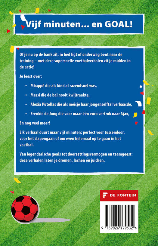 zoals Frenkie de Jong en Cody Gakpo, onwaarschijnlijke comebacks, de ergste rode kaarten en de vuilste voetbaltrucs. Elk verhaal duurt maar 5 minuten: perfect om tijdens het ontbijt, voor het slapengaan, of onderweg te lezen!