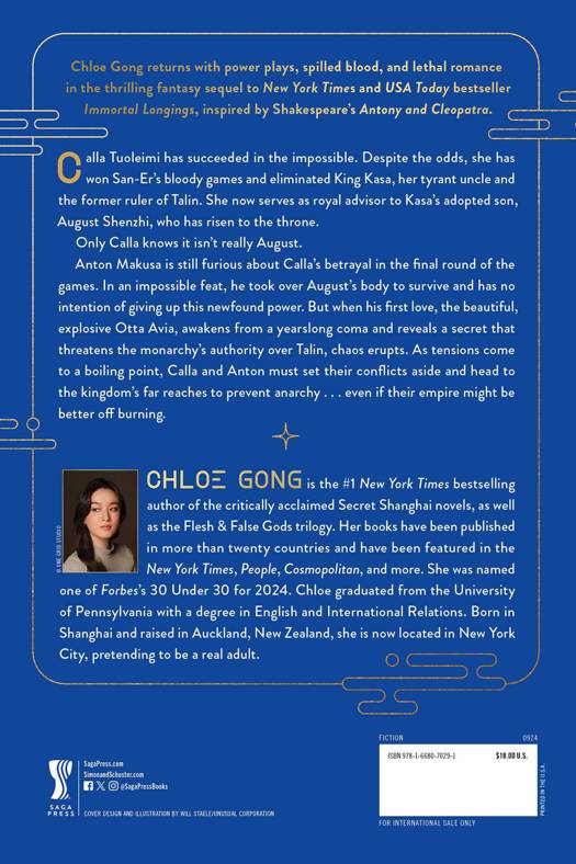 Anton Makusa is still furious about Calla’s betrayal in the final round of the games. In an impossible feat, he took over August’s body to survive, and has no intention of giving up this newfound power. But when his first love, the beautiful, explosive Otta Avia, awakens from a years-long coma and reveals a secret that threatens the monarchy’s authority over Talin, chaos erupts. As tensions come to a boiling point, Calla and Anton must set their conflicts aside and head to the kingdom’s far reaches to prevent anarchy…even if their empire might be better off burning.