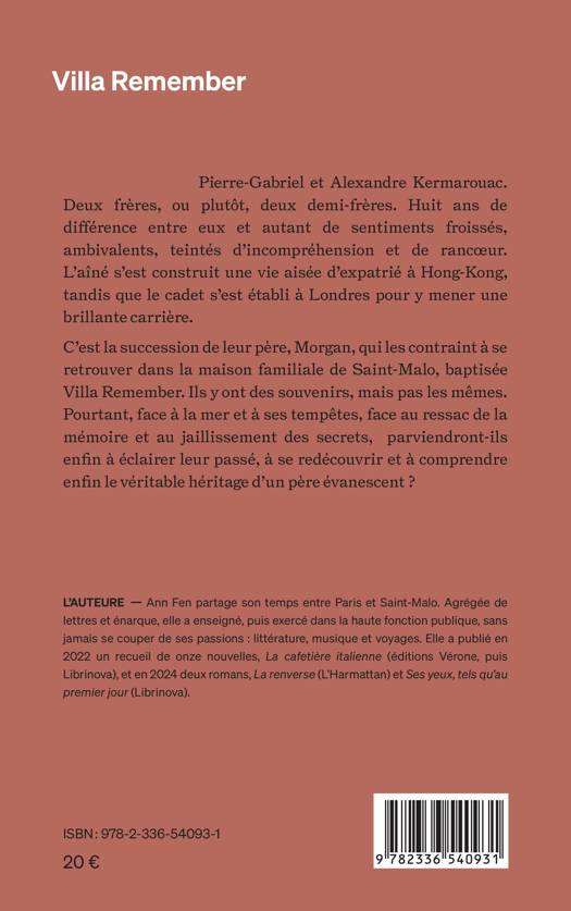 Pierre-Gabriel et Alexandre Kermarouac. Deux frères, ou plutôt, deux demi-frères. Huit ans de différence entre eux et autant de sentiments froissés, ambivalents, teintés d'incompréhension et de rancoeur. L'aîné s'est construit une vie aisée d'expatrié à Hong-Kong, tandis que le cadet s'est établi à Londres pour y mener une brillante carrière. C'est la succession de leur père, Morgan, qui les contraint à se retrouver dans la maison familiale de Saint-Malo, baptisée Villa Remember. Ils y ont des souvenirs, mais pas les mêmes. Pourtant, face à la mer et à ses tempêtes, face au ressac de la mémoire et au jaillissement des secrets, parviendront-ils enfin à éclairer leur passé, à se redécouvrir et à comprendre enfin le véritable héritage d'un père évanescent ?