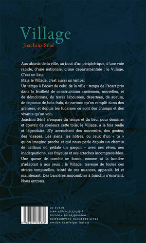 Aux abords de la ville, au bout d'un périphérique, d'une voie rapide, d'une nationale, d'une départementale : Le Village. C'est un lieu. Mais Le Village, c'est aussi un temps. Un temps à l'écart de celui de la ville : temps de l'écart pris dans le feuilleté de constructions anciennes, nouvelles, et de démolitions, de terres labourées, désertées, de sueurs, de copeaux de bois frais, de cartons qu'on remplit dans des greniers, et depuis les lucarnes ce sont des champs et des vivants qu'on voit. Joachim Séné s'empare du temps et du lieu, pour dessiner et couvrir de couleurs cette toile, Le Village, à la fois réelle et légendaire. S'y accrochent des souvenirs, des gestes, des visages. Les siens, les nôtres, ou ceux d'un « tu » qu'on imagine proche et qui nous parle depuis un chemin de cailloux où pédale un petit garçon - avec ses rêves, ses inadéquations, ses frayeurs et ses attaches incompressibles. Une queue de comète se forme, comme si la lumière s'adaptait à nos yeux : Le Village, traversé de toutes ces strates temporelles, teinté de ces nuances, apparaît. Ici et maintenant. Des barrières impossibles à franchir s'écartent. Nous entrons.