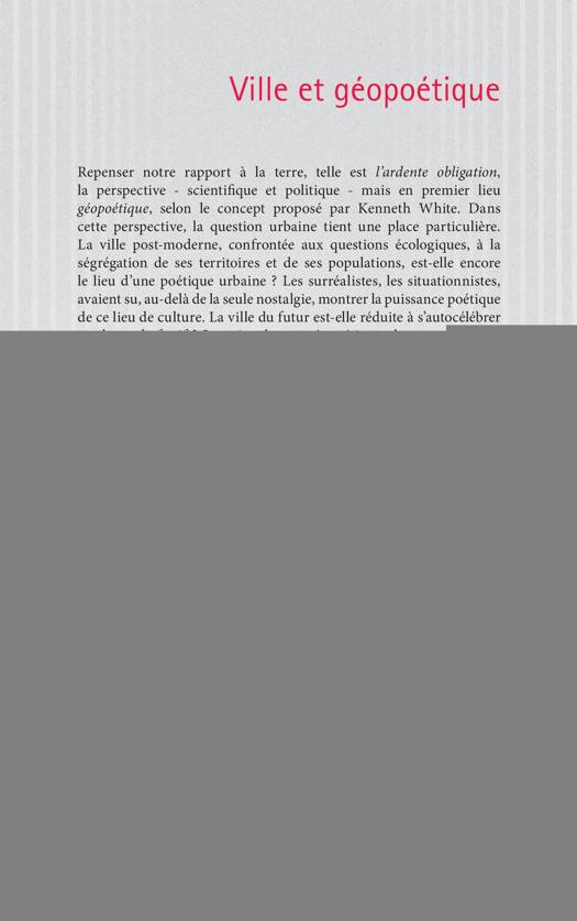 La ville post-moderne, confrontée aux questions écologiques, à la ségrégation de ses territoires et de ses populations, est-elle encore le lieu d'une poétique urbaine ? Les surréalistes, les situationnistes, avaient su, au-delà de la seule nostalgie, montrer la puissance poétique de ce lieu de culture. Ce volume confronte les questionnements et marque une étape dans le travail critique que le devenir urbain de l'humain contemporain rend plus urgent que jamais.