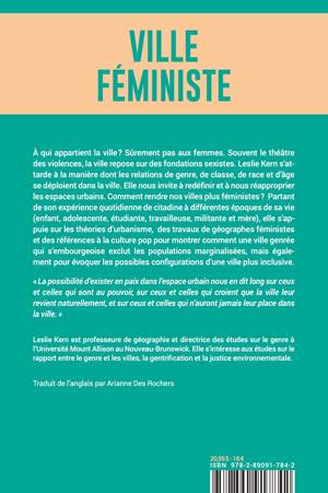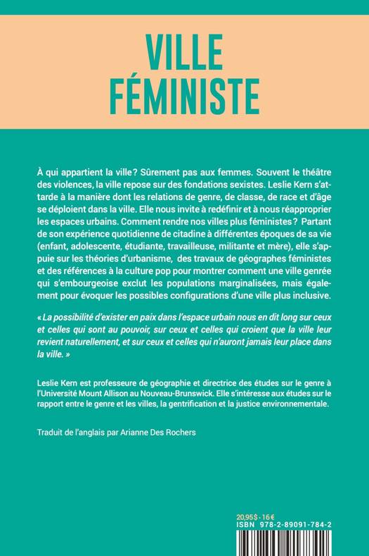 À partir de son expérience quotidienne de citadine, à titre de travailleuse, conjointe et mère, la géographe féministe Leslie Kern évoque divers aspects du rapport des femmes à la ville. Les questions de violence et d'agression sont abordées de façon concrète, incarnée. Kern s'attarde à la manière dont les relations de genre, de classe, de race, d'âge se déploient dans la ville. Elle s'appuie sur des études en urbanisme, en géographie et sur des références à la culture pop, pour montrer comment une ville genrée qui s'embourgeoise exclut les populations marginalisées, mais également pour évoquer les possibles configurations d'une ville plus inclusive.