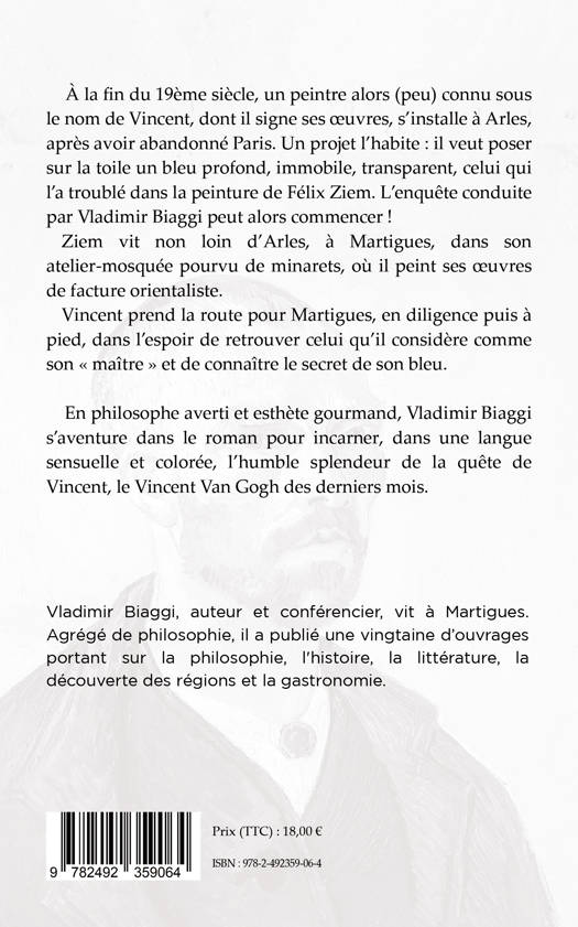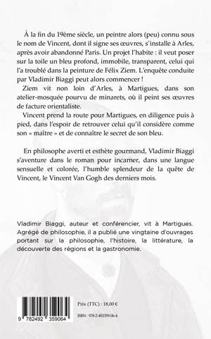 À la fin du 19ème siècle, un peintre alors (peu) connu sous le nom de Vincent, dont il signe ses œuvres, s’installe à Arles, après avoir abandonné Paris. Un projet l’habite : il veut poser sur la toile un bleu profond, immobile, transparent, celui qui l’a troublé dans la peinture de Félix Ziem. L’enquête conduite par Vladimir Biaggi peut alors commencer ! Ziem vit non loin d’Arles, à Martigues, dans son atelier-mosquée pourvu de minarets, où il peint ses œuvres de facture orientaliste. Vincent prend la route pour Martigues, en diligence puis à pied, dans l’espoir de retrouver celui qu’il considère comme son « maître » et de connaître le secret de son bleu.