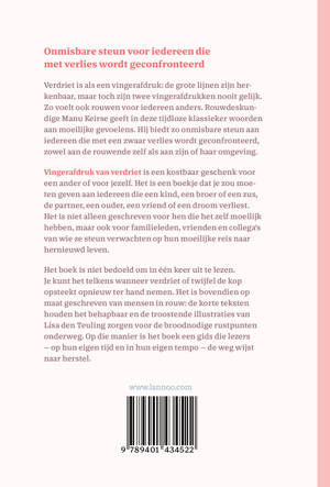 Vingerafdruk van verdriet is een kostbaar geschenk voor een ander of voor jezelf. Het is een boekje dat je zou moeten geven aan iedereen die een kind, een broer of een zus, de partner, een ouder, een vriend of een droom verliest. Het is niet alleen geschreven voor hen die het zelf moeilijk hebben, maar ook voor familieleden, vrienden en collega's van wie ze steun verwachten op hun moeilijke reis naar hernieuwd leven.