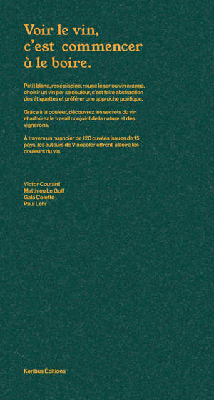 Petit blanc, rosé piscine, rouge léger ou vin orange, choisir un vin par sa couleur, c'est faire abstraction des étiquettes et préférer une approche sensorielle. Grâce à ce nuancier inédit, découvrez les secrets du vin, apprenez à reconnaître leur origine et admirez le travail conjoint de la nature et des vignerons. À travers les fiches techniques de 120 cuvées issues de 15 pays, les auteurs de Vinocolor offrent à boire le vin avec les yeux.