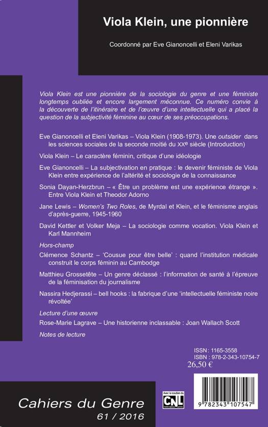 Viola Klein est une pionnière de la sociologie du genre et une féministe longtemps oubliée, encore largement méconnue. Ce nouveau numéro des Cahiers du genre convie à la découverte de l'itinéraire et de l'oeuvre d'une intellectuelle qui a placé la question de la subjectivité féminine au coeur de ses préoccupations.