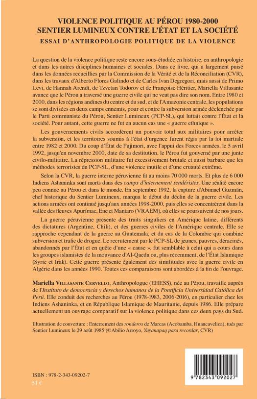 Le Pérou a traversé une guerre civile qui ne veut pas dire son nom. Entre 1980 et 2000, Sentier Lumineux lutte contre l'Etat et la société. De 1992 jusqu'en 2000, le pays est gouverné par une junte civilo-militaire. La guerre péruvienne se différencie des dictatures (Argentine, Chili), des guerres civiles d'Amérique centrale. Elle se rapproche de la guerre au Guatemala et en Colombie qui combine subversion et trafic de drogue. Cette guerre présente des points communs avec la guerre civile en Algérie dans les années 1990.