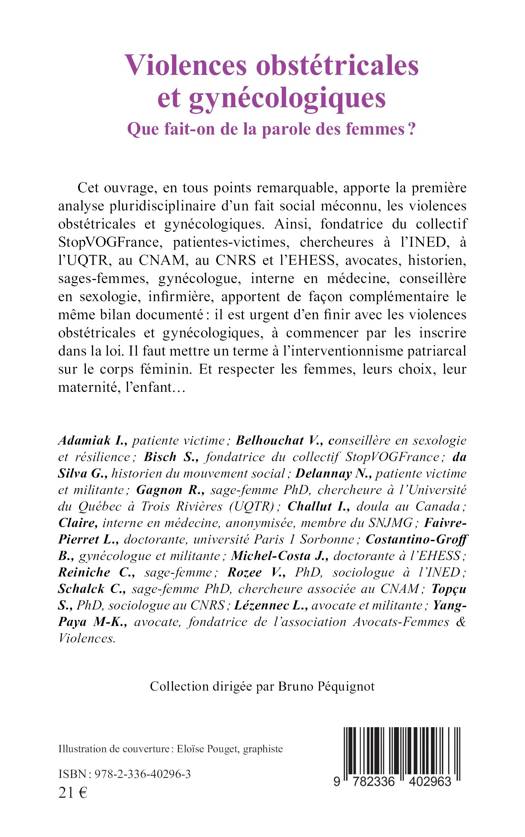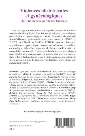 Cet ouvrage, en tous points remarquable, apporte la première analyse pluridisciplinaire d'un fait social méconnu, les violences obstétricales et gynécologiques. Ainsi, fondatrice du collectif StopVOGFrance, patientes-victimes, chercheures à l'INED, à l'UQTR, au CNAM, au CNRS et l'EHESS, avocates, historien, sages-femmes, gynécologue, interne en médecine, conseillère en sexologie, infirmière, apportent de façon complémentaire le même bilan documenté il est urgent d'en finir avec les violences obstétricales et gynécologiques, à commencer par les inscrire dans la loi. Il faut mettre un terme à l'interventionnisme patriarcal sur le corps féminin. Et respecter les femmes, leurs choix, leur maternité, l'enfant...