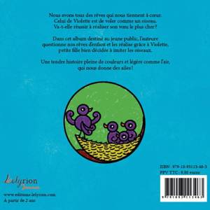 Nous avons tous des rêves qui nous tiennent à coeur. Celui de Violette est de voler comme un oiseau. Va-t-elle réussir à réaliser son voeu le plus cher ? Dans cet album destiné au jeune public, l'auteure questionne nos rêves d'enfant et les réalités grâce à Violette, petite fille bien décidée à imiter les oiseaux. Une tendre histoire pleine de couleurs et légère comme l'air, qui nous donne des ailes !