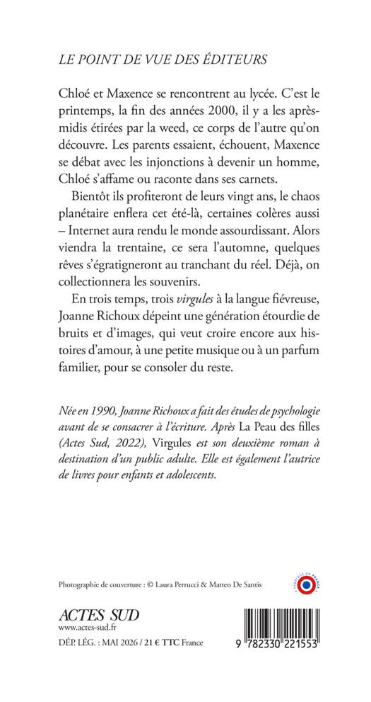 Chloé et Maxence se rencontrent au lycée. C'est le printemps, la fin des années 2000, il y a les après-midis étirées par la weed, ce corps de l'autre qu'on découvre. Les parents essaient, échouent, Maxence se débat avec les injonctions à devenir un homme, Chloé s'affame ou raconte dans ses carnets. Bientôt ils profiteront de leurs vingt ans, le chaos planétaire enflera cet été-là, certaines colères aussi - Internet aura rendu le monde assourdissant. Alors viendra la trentaine, ce sera l'automne, quelques rêves s'égratigneront au tranchant du réel. Déjà, on collectionnera les souvenirs. En trois temps, trois virgules à la langue fiévreuse, Joanne Richoux dépeint une génération étourdie de bruits et d'images, qui veut croire encore aux histoires d'amour, à une petite musique ou à un parfum familier, pour se consoler du reste.