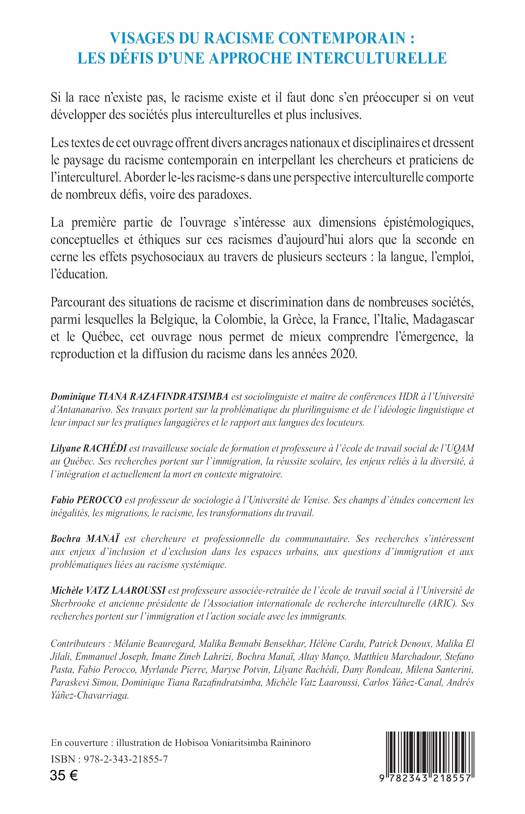 Si la race n’existe pas, le racisme existe et il faut donc s’en préoccuper si on veut développer des sociétés plus interculturelles et plus inclusives. Les textes de cet ouvrage offrent divers ancrages nationaux et disciplinaires et dressent le paysage du racisme contemporain en interpellant les chercheurs et praticiens de l’interculturel. Aborder le-les racisme-s dans une perspective interculturelle comporte de nombreux défis, voire des paradoxes. La première partie de l’ouvrage s’intéresse aux dimensions épistémologiques, conceptuelles et éthiques sur ces racismes d’aujourd’hui alors que la seconde en cerne les effets psychosociaux au travers de plusieurs secteurs : la langue, l’emploi, l’éducation.