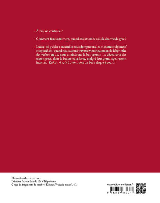 – Laisse-toi guider : ensemble nous dompterons les monstres subjonctif et optatif, et, quand nous aurons traversé victorieusement le labyrinthe des verbes en mi, nous atteindrons le but promis : la découverte des textes grecs, dont la beauté et la force, malgré leur grand âge, restent intactes. Kalo;ı oJ kivndunoı, c’est un beau risque à courir !
