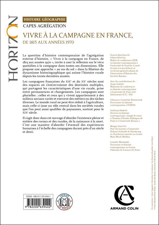 La question d’histoire contemporaine de l’agrégation externe d’histoire, « Vivre à la campagne en France, de 1815 aux années 1970 », invite à axer la réflexion sur le vécu quotidien à la campagne dans toutes ses dimensions. Elle propose une approche « au ras du sol » dans la filiation du dynamisme historiographique qui anime l’histoire rurale depuis les trente dernières années.