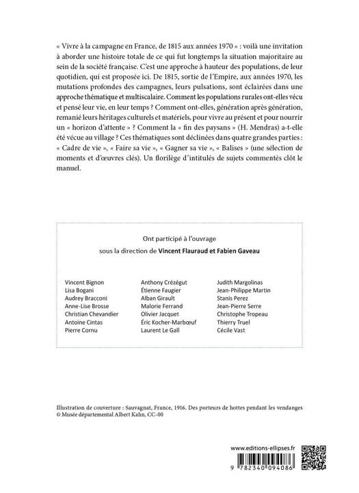 « Vivre à la campagne en France, de 1815 aux années 1970 » : voilà une invitation à aborder une histoire totale de ce qui fut longtemps la situation majoritaire au sein de la société française. C’est une approche à hauteur des populations, de leur quotidien, qui est proposée ici. De 1815, sortie de l’Empire, aux années 1970, les mutations profondes des campagnes, leurs pulsations, sont éclairées dans une approche thématique et multiscalaire. Comment les populations rurales ont-elles vécu et pensé leur vie, en leur temps ? Comment ont-elles, génération après génération, remanié leurs héritages culturels et matériels, pour vivre au présent et pour nourrir un « horizon d’attente » ? Comment la “fin des paysans” (H. Mendras) a-t-elle été vécue au village ? Ces thématiques sont déclinées dans quatre grandes parties : “Cadre de vie”, “Faire sa vie”, “Gagner sa vie”, “Balises” (une sélection de moments et d’œuvres clés). Une sélection d’intitulés de sujets commentés clôt le manuel.