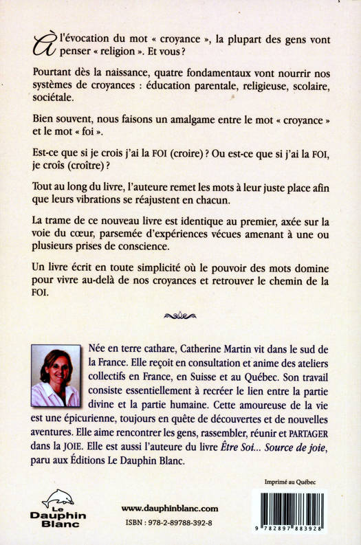 À l'évocation du mot « croyance », la plupart des gens vont penser « religion ». Et vous ? Pourtant dès la naissance, quatre fondamentaux vont nourrir nos systèmes de croyances : éducation parentale, religieuse, scolaire, sociétale. Bien souvent, nous faisons un amalgame entre le mot « croyance » et le mot « foi ». Est-ce que si je crois, j'ai la foi (croire)? Ou est-ce que si j'ai la foi, je croîs (croître) ? Tout au long du livre, l'auteure remet les mots à leur juste place afin que leurs vibrations se réajustent en chacun. La trame de ce nouveau livre est identique au premier constitué de trois parties, toujours basées sur des faits réels, des constats, du vécu amenant à une ou plusieurs prises de conscience.