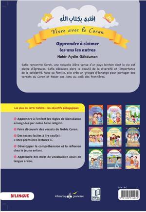 Immergez-vous dans l’univers chaleureux et lumineux de Safia et de sa famille, où chaque jour est l’occasion d’apprendre et de grandir. À travers les petits gestes quotidiens, cette série de 10 livres bilingues guide les enfants vers une compréhension douce et inspirante de valeurs essentielles comme le respect, la générosité, et l’amour familial, le tout éclairé par la sagesse des versets coraniques : 1- Apprendre à s’aimer les uns les autresSafia rencontre Sârah, une nouvelle élève venue d’un pays lointain dont la vie est pleine d’épreuves. Safia découvre alors la beauté de la diversité et l’importance de la solidarité. Avec sa famille, elle crée un groupe d’échange pour partager des versets du Coran et tisser des liens au-delà des frontières.Autres épisodes2- La Confiance : une grande responsabilité 3- La Bienfaisance : les mains du cœur 4- Le Trésor de la Patience5- Main dans la main : Fraternité et amour6- Donner c'est aimer 7- Le Temps, un cadeau précieux8- Des Conseils pour grandir ensemble9- Ne juge pas trop vite : Évite la médisance10- Le Messager (ﷺ) de la Miséricorde