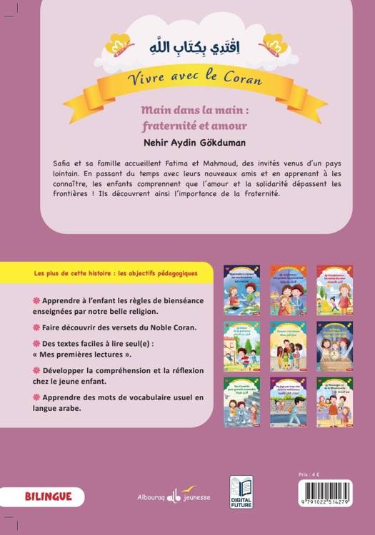 Immergez-vous dans l’univers chaleureux et lumineux de Safia et de sa famille, où chaque jour est l’occasion d’apprendre et de grandir. À travers les petits gestes quotidiens, cette série de 10 livres bilingues guide les enfants vers une compréhension douce et inspirante de valeurs essentielles comme le respect, la générosité, et l’amour familial, le tout éclairé par la sagesse des versets coraniques : 5- Main dans la main : Fraternité et amourSafia et sa famille accueillent Fatima et Mahmoud, des invités venus d’un pays lointain. En passant du temps avec leurs nouveaux amis et en apprenant à les connaître, les enfants comprennent que l’amour et la solidarité dépassent les frontières ! Ils découvrent ainsi l’importance de la fraternité.1- Apprendre à s’aimer les uns les autres2- La Confiance : une grande responsabilité 3- La Bienfaisance : les mains du cœur 4- Le Trésor de la Patience6- Donner c'est aimer 7- Le Temps, un cadeau précieux8- Des Conseils pour grandir ensemble9- Ne juge pas trop vite : Évite la médisance10- Le Messager (ﷺ) de la Miséricorde
