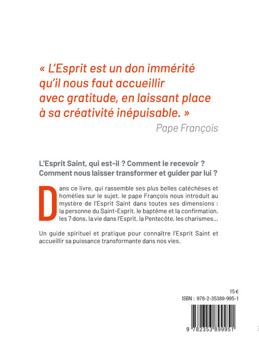 L’Esprit Saint, qui est-il ? Comment le recevoir ? Comment nous laisser transformer et guider par lui ? Dans ce livre, qui rassemble ses plus belles catéchèses et homélies sur le sujet, le pape François nous introduit au mystère de l’Esprit Saint dans toutes ses dimensions : la personne du Saint-Esprit, le baptême et la confirmation, les 7 dons, la vie dans l’Esprit, la Pentecôte, les charismes… Un guide spirituel et pratique pour connaître l’Esprit Saint et accueillir sa puissance transformante dans nos vies. Depuis le début de son pontificat, le pape François a consacré de nombreuses catéchèses à l’Esprit Saint et à la vie dans l’Esprit, particulièrement appréciées par les fidèles.