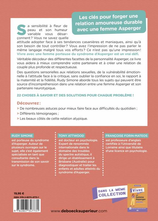 Des questions sensorielles aux relations sexuelles, de la vulnérabilité émotionnelle à l’attitude face à la critique, sans oublier la confiance en soi, le rapport à la maternité et la fidélité, Rudy Simone aborde tous les sujets qui peuvent être source d’incompréhension dans une relation entre une femme Asperger et son partenaireneurotypique.