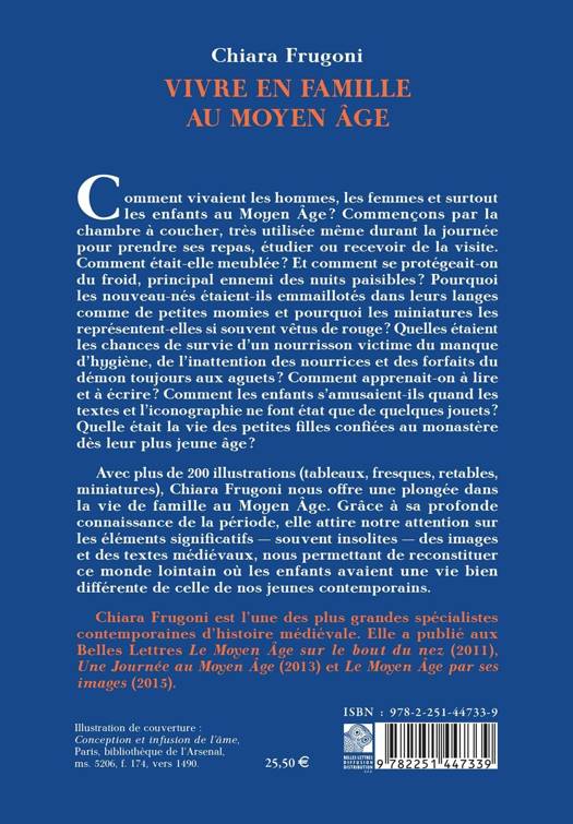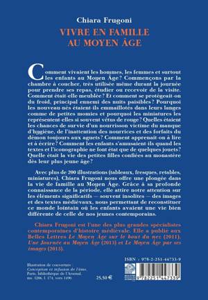 Comment vivaient les hommes, les femmes et surtout les enfants au Moyen Age ? Commencons par la chambre a coucher, tres utilisee meme durant la journee pour prendre ses repas, etudier ou recevoir de la visite. Comment etait-elle meublee ? Et comment se protegeait-on du froid, principal ennemi des nuits paisibles ? Pourquoi les nouveau-nes etaient-ils emmaillotes dans leurs langes comme de petites momies et pourquoi les miniatures les representent-elles si souvent vetus de rouge ? Quelles etaient les chances de survie d'un nourrisson victime du manque d'hygiene, de l'inattention des nourrices et des forfaits du demon toujours aux aguets ? Comment apprenait-on a lire et a ecrire ? Comment les enfants s'amusaient-ils quand les textes et l'iconographie ne font etat que de quelques jouets ? Quelle etait la vie des petites filles confiees au monastere des leur plus jeune age ? Avec plus de 200 illustrations (tableaux, fresques, retables, miniatures), Chiara Frugoni nous offre une plongee dans la vie de famille au Moyen Age. Grace a sa profonde connaissance de la periode, elle attire notre attention sur les elements significatifs - souvent insolites - des images et des textes medievaux, nous permettant de reconstituer ce monde lointain ou les enfants avaient une vie bien differente de celle de nos jeunes contemporains.