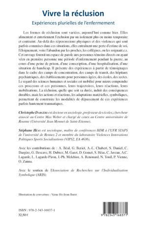 Cet ouvrage fournit un espace de parole aux personnes témoins directs ou ayant vécu en première personne une période d'enfermement pendant la guerre, au cours d'une peine de prison, d'une conscription, d'une hospitalisation, d'une situation de handicap. Il présente des expériences à partir de témoignages dans le cadre des camps de concentration, des camps de transit, des hôpitaux psychiatriques, des établissements pour personnes âgées, des écoles, des sectes. Le regard des sciences humaines et sociales est mobilisé pour mieux comprendre ces processus et ces personnes, leurs trajectoires, leurs réactions, leurs mobilisations. La réclusion, quelle que soit sa durée, induit des conséquences durables, mais les actions et réactions, les adaptations matérielles, symboliques, permettent de construire les modalités de dépassement de ces expériences parfois hautement traumatiques.
