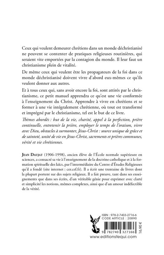 Ceux qui veulent demeurer chrétiens dans un monde déchristianisé ne peuvent se contenter de pratiques religieuses routinières, qui seraient vite emportées par la contagion du monde. Il leur faut un christianisme plein de vitalité. De même ceux qui veulent être les propagateurs de la foi dans ce monde déchristianisé doivent vivre d'abord euxmêmes ce qu'ils veulent donner aux autres. Et à tous ceux qui, sans avoir encore la foi, sont attirés par le christianisme, ce petit manuel apprendra ce qu'est une vie conformée à l'enseignement du Christ. Apprendre à vivre en chrétiens et à se former à une vie intégralement chrétienne, où tout est transformé et imprégné par le christianisme, tel est le but de ce livre.