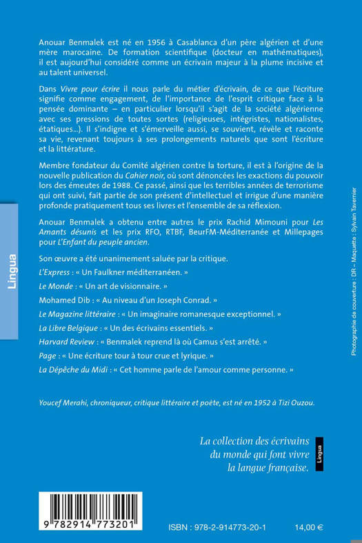 Dans Vivre pour écrire il nous parle du métier d'écrivain, de ce que l'écriture signifie comme engagement, de l'importance de l'esprit critique face à la pensée dominante - en particulier lorsqu'il s'agit de la société algérienne avec ses pressions de toutes sortes (religieuses, intégristes, nationalistes, étatiques...). Il s'indigne et s'émerveille aussi, se souvient, révèle et raconte sa vie, revenant toujours à ses prolongements naturels que sont l'écriture et la littérature.
