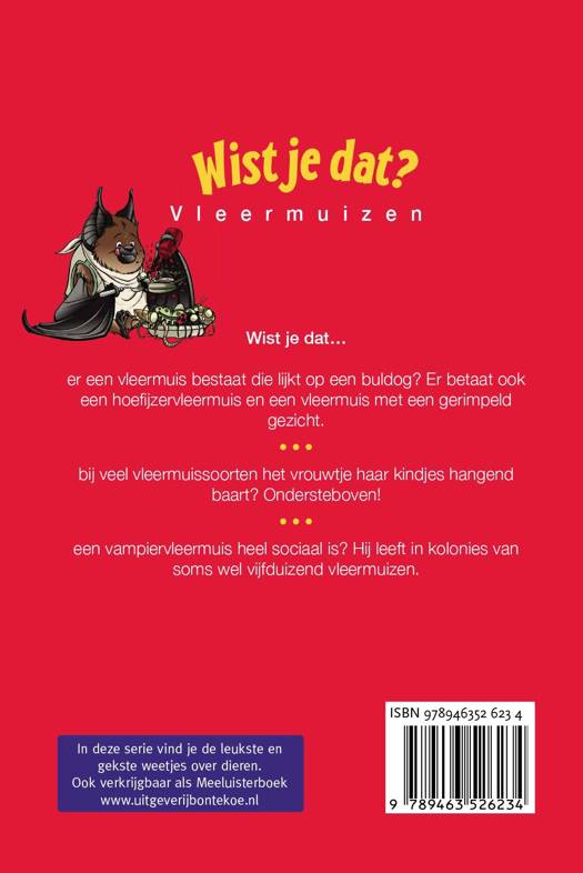 Wist je dat... er een vleermuis bestaat die lijkt op een buldog? Er bestaat ook een hoefijzervleermuis en een vleermuis met een gerimpeld gezicht. bij veel vleermuissoorten het vrouwtje haar kindjes hangend baart? Ondersteboven! een vampiervleermuis heel sociaal is? Hij leeft in kolonies van soms wel vijfduizend vleermuizen.