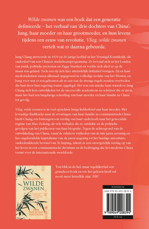 Wilde zwanen was een boek dat een generatie definieerde – het verhaal van ‘drie dochters van China’: Jung, haar moeder en haar grootmoeder, en hun levens tijdens een eeuw van revolutie. Vlieg, wilde zwanen vertelt wat er daarna gebeurde.