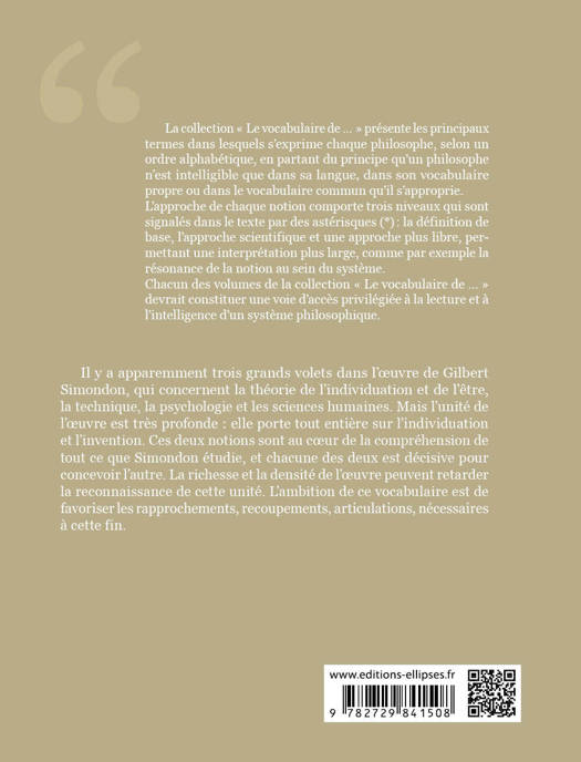 Il y a apparemment trois grands volets dans l’œuvre de Gilbert Simondon, qui concernent la théorie de l’individuation et de l’être, la technique, la psychologie et les sciences humaines. Mais l’unité de l’œuvre est très profonde : elle porte tout entière sur l’individuation et l’invention. Ces deux notions sont au cœur de la compréhension de tout ce que Simondon étudie, et chacune des deux est décisive pour concevoir l’autre. La richesse et la densité de l’œuvre peuvent retarder la reconnaissance de cette unité. L’ambition de ce vocabulaire est de favoriser les rapprochements, recoupements, articulations, nécessaires à cette fin.